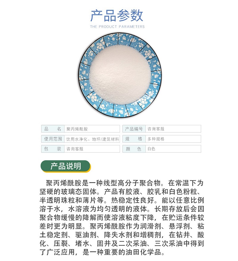 造紙助劑:在造紙工業(yè)中可用作紙張干強劑 助留劑 ,能極大的提高紙張質(zhì)量 節(jié)約成本,提高造紙廠的生產(chǎn)能力。可以直接與無機鹽離子,纖維以及其它有機高分子發(fā)生靜電橋梁作用以達到增強紙張的物理強度,減少纖維或填料的流失。加快濾水 起到了增強  助留 助濾的作用,同時在脫模過程中起到了明顯的絮凝效果。